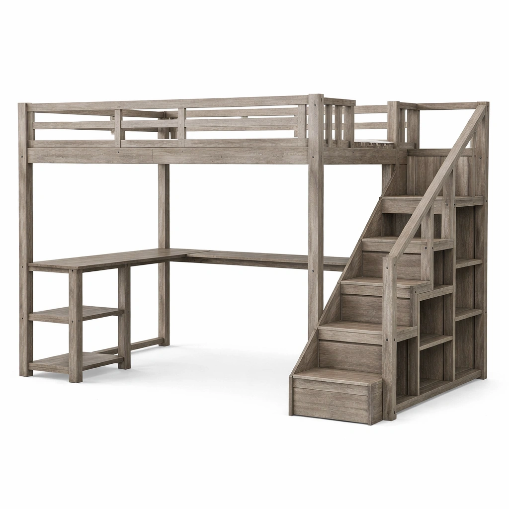 Hochbett aus holz grau mit schreibtisch und treppe