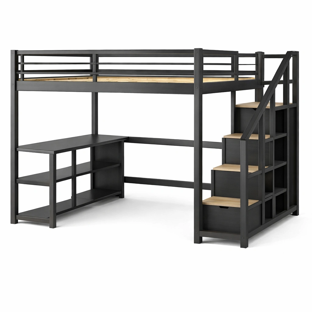 Hochbett mit einem Rahmen aus pulverbeschichtetem Stahl und Oberflächen aus Holzfurnier. Die Treppe hat integrierte Aufbewahrungsmöglichkeiten. Geeignet für Personen ab 6 Jahren.