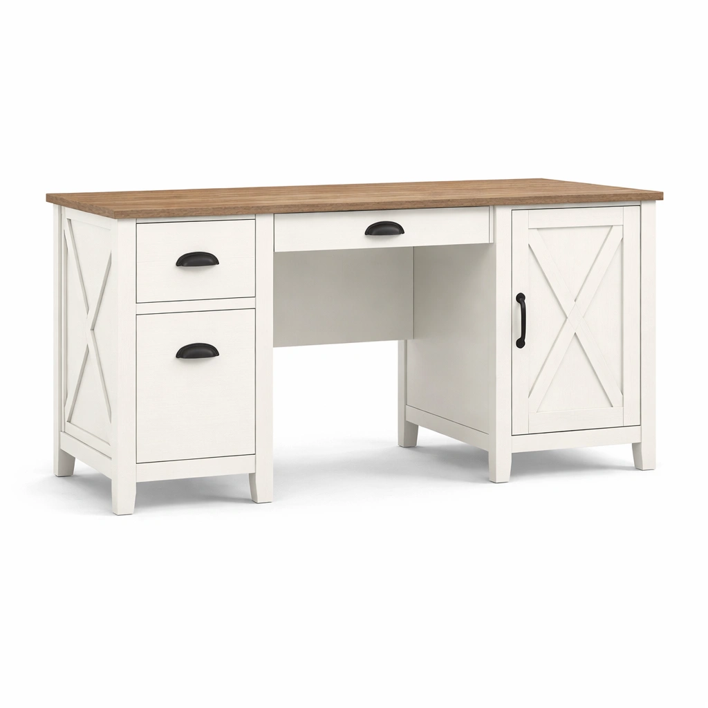 Der Schreibtisch besteht aus MDF mit Eichenfurnier auf der Tischplatte und hat eine weiße Lackierung. Er verfügt über zwei Schubladen und einen Schrank für zusätzlichen Stauraum.
